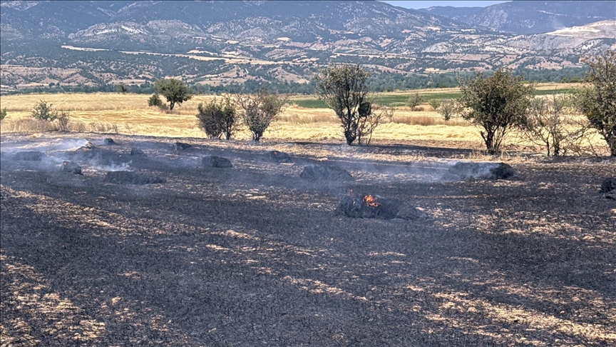 Tarladaki alevleri kontrol altına alan ekiplerin ağaçlık alanda devam eden yangına müdahalesi sürüyor.