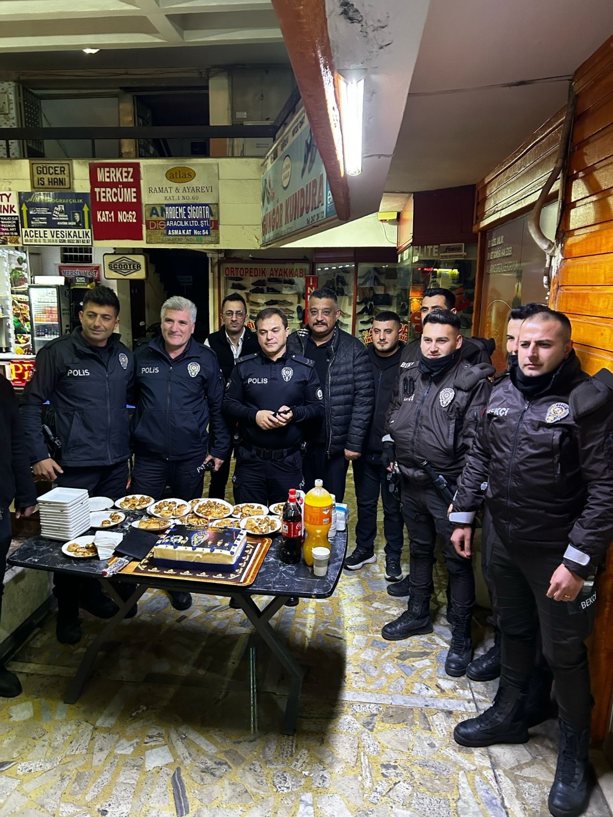 İhbar üzerine bölgeye giden polisler, karşılaştıkları sürprizle şaşkınlık yaşadı. Kutlama pastasını hep birlikte kesen emniyet mensupları, esnafa teşekkür etti.