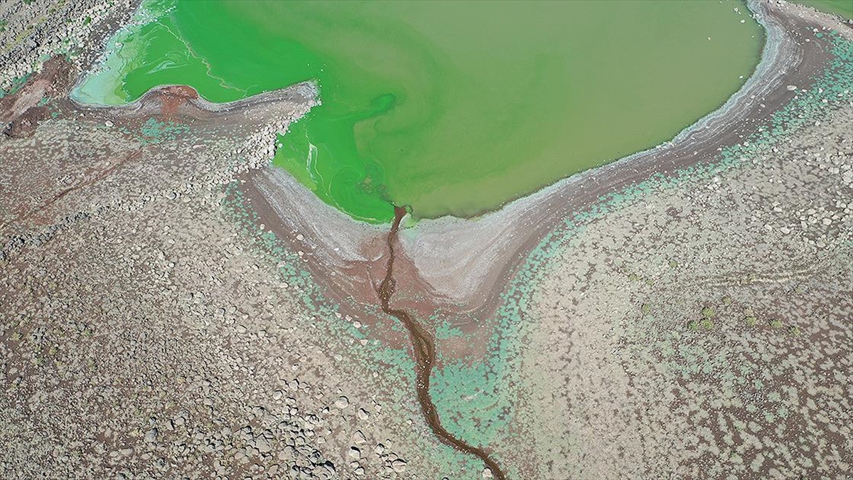 Neredeyse kuruma noktasına gelen göletteki çekilme ve tabanda oluşan çatlaklar, dronla görüntülendi.