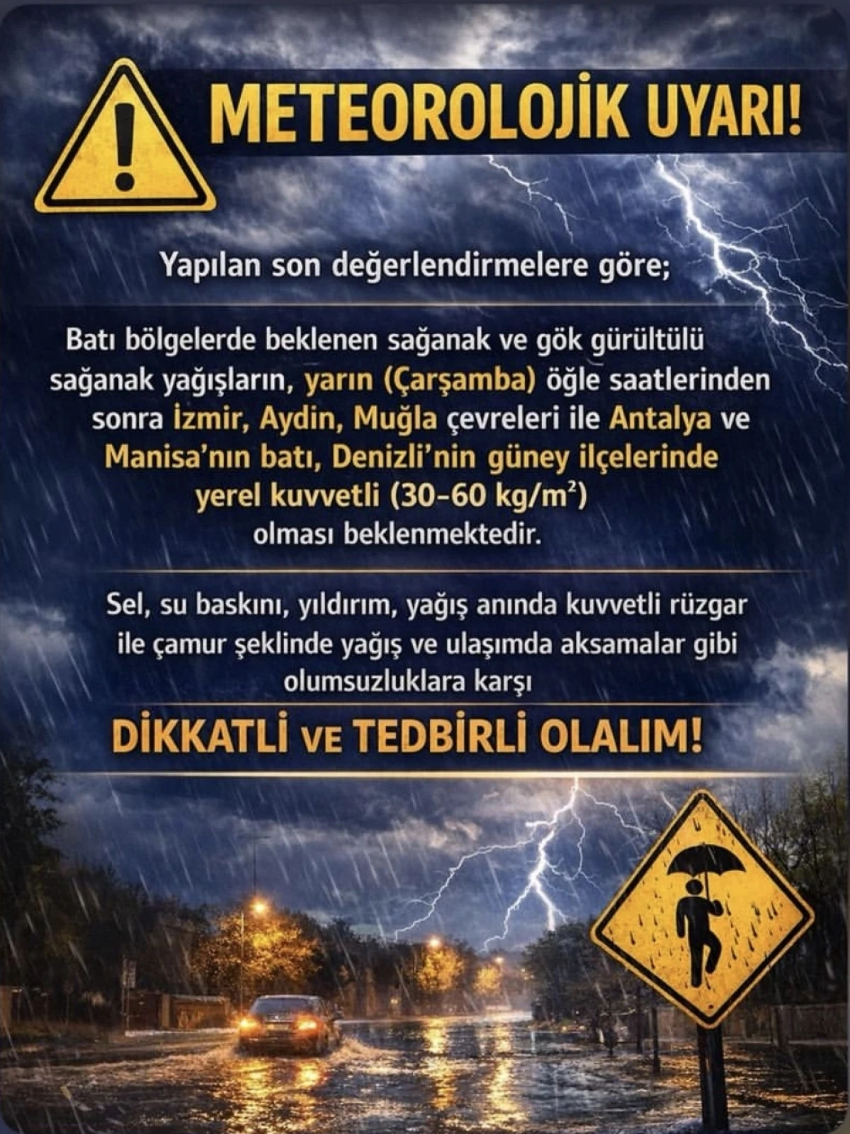 İçişleri Bakanlığı İzmir, Aydın, Muğla, Antalya, Manisa ve Denizli’nin bazı ilçeleri için sarı kod uyarısı verdi. Kuvvetli sağanak ve fırtına bekleniyor.