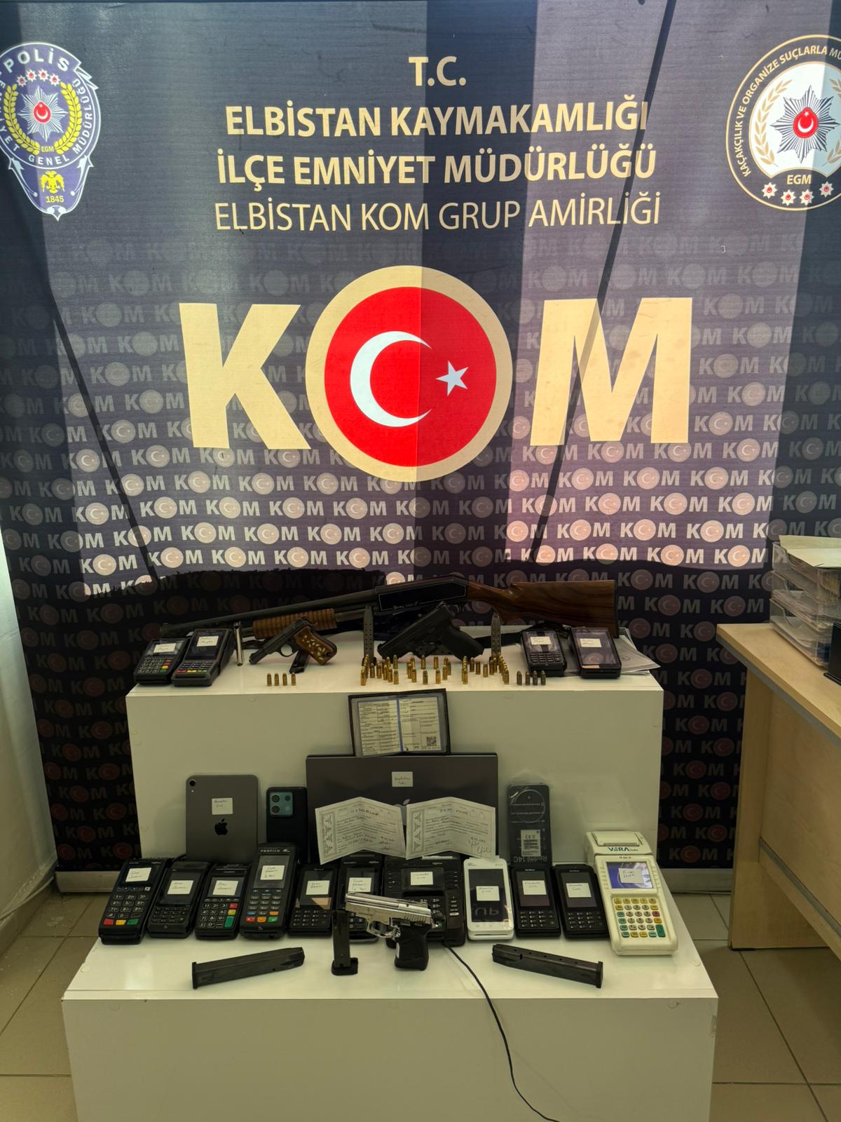 8 şüphelinin gözaltına alındığı operasyonda 2 ruhsatsız tabanca, av tüfeği, kurusıkı tabanca, 15 pos cihazı, senet, tapu sözleşmeleri ve dijital materyaller ele geçirildi.