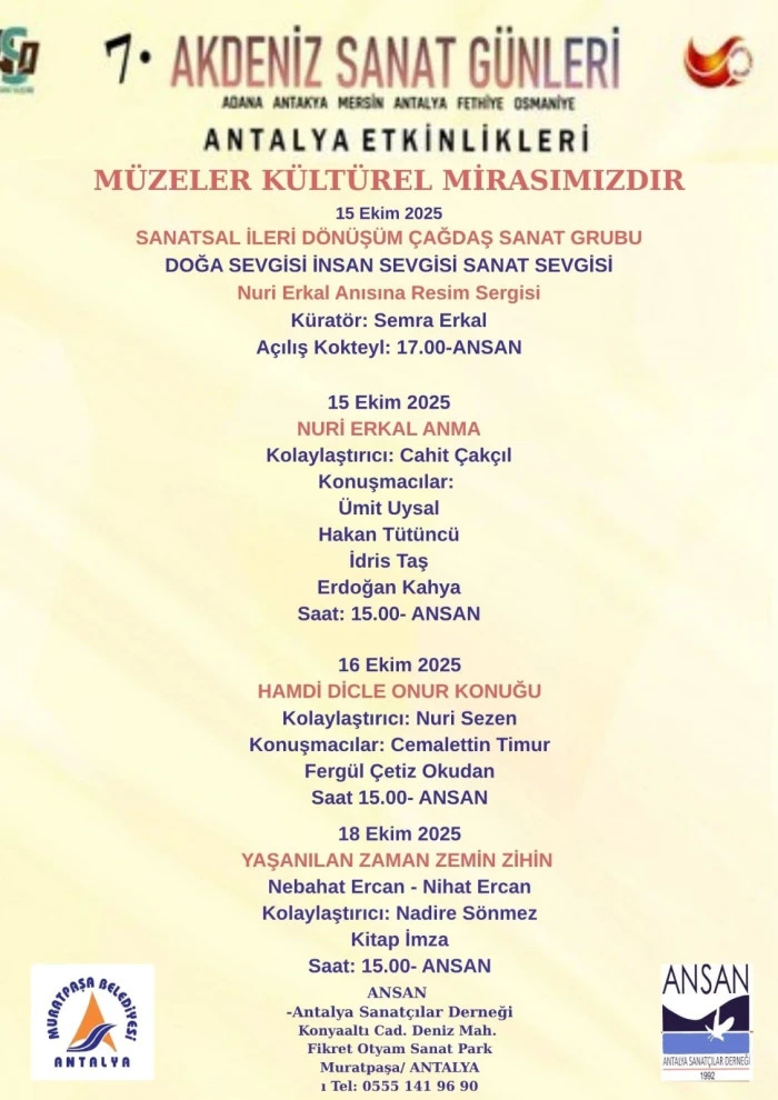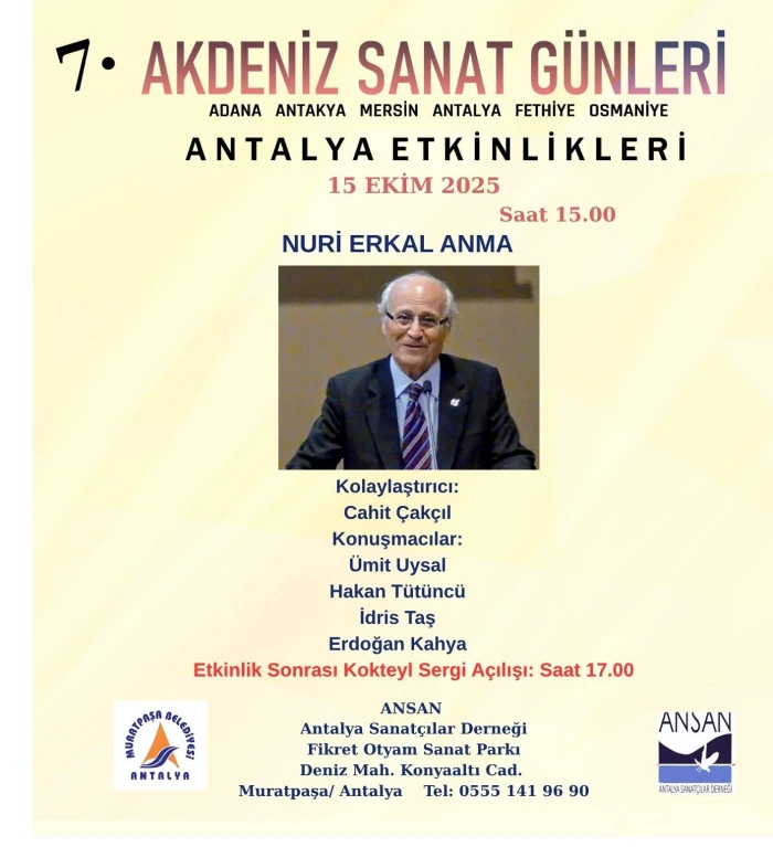 Antalya Sanatçılar Derneği (ANSAN) tarafından bu yıl 7’ncisi düzenlenen Akdeniz Sanat Günleri, derneğe uzun yıllar emek veren merhum emekli TRT Prodüktörü İstanbul ve Antalya radyosu prodüktörü, emekli Edebiyat öğretmeni ve sanatçı Nuri Erkal anısına gerçekleştirilen etkinliklerle başladı. Etkinlik, anma programı ve ardından karma resim sergisiyle sanatseverlere unutulmaz anlar yaşattı.