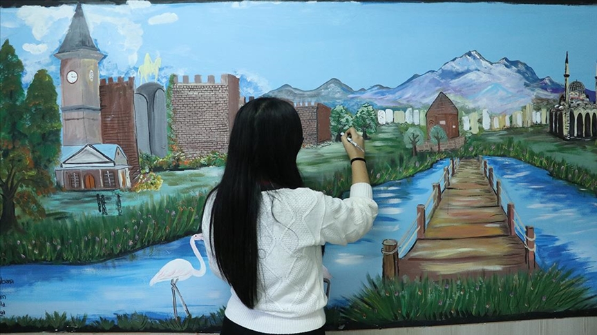 Farkındalık için yapılan bir işin ardından okulun duvarları ve bahçe duvarını da süslemeye karar verdiklerini belirten Kuraç, kentin tarihi ve turistik yerlerinin yanında kütüphaneyi kitap, bahçeyi de doğa görselleriyle resmettiklerini dile getirdi.