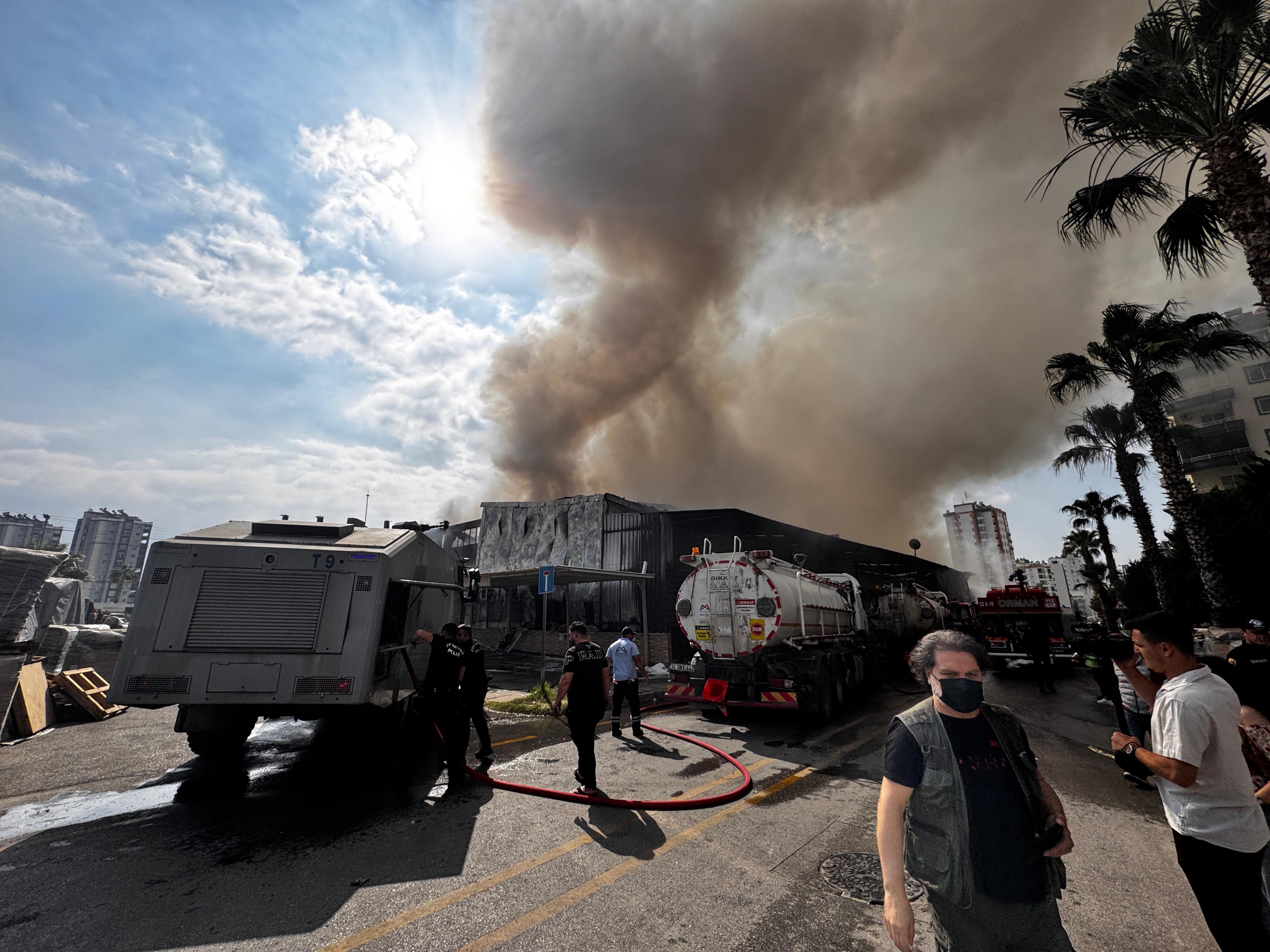 Mersin'in merkez Toroslar ilçesinde ses ve görüntü sistemleri üretilen fabrikada çıkan yangına müdahale ediliyor.