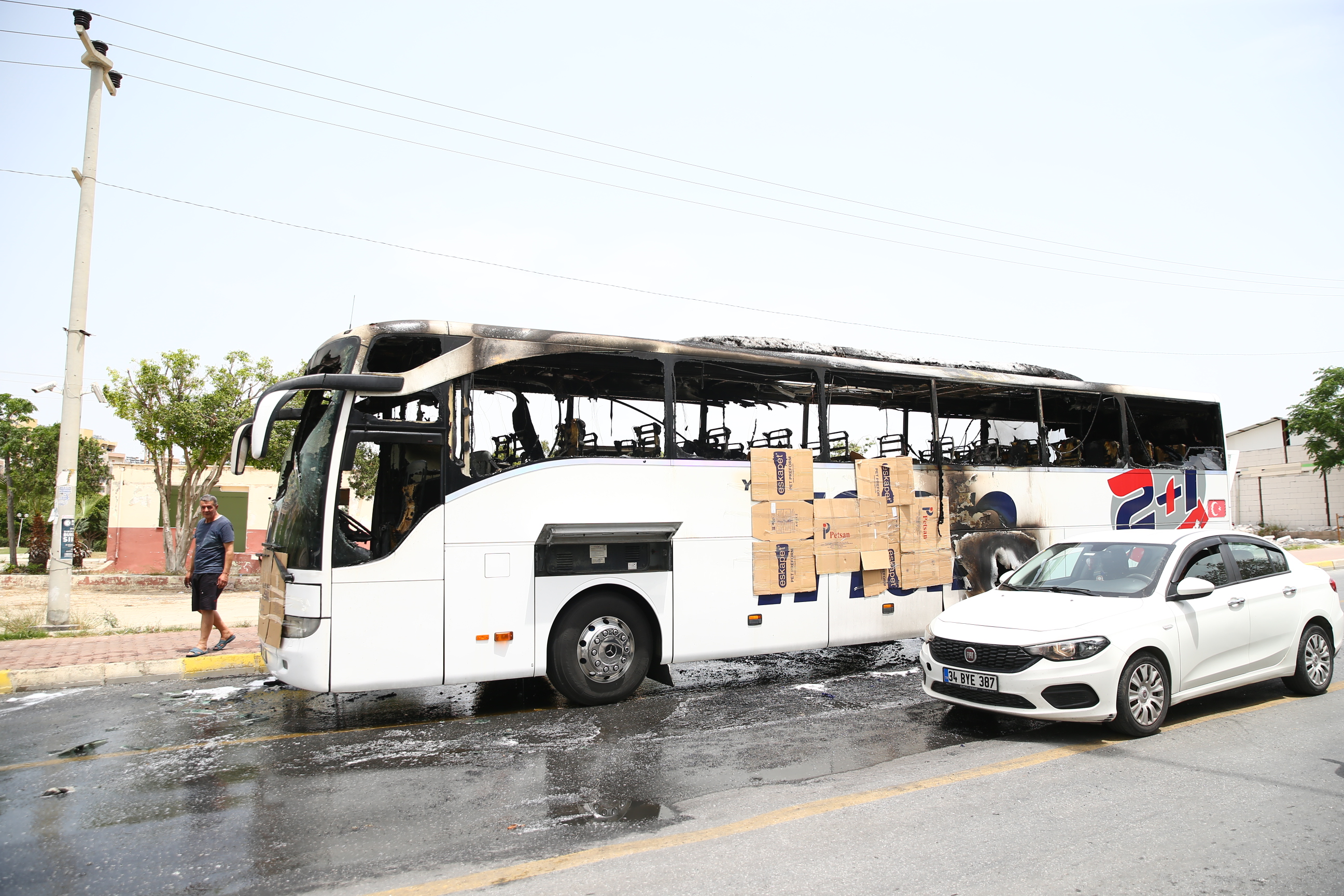 Mersin'in Toroslar ilçesinde seyir halindeyken alev alan yolcu otobüsü kullanılamaz hale geldi.